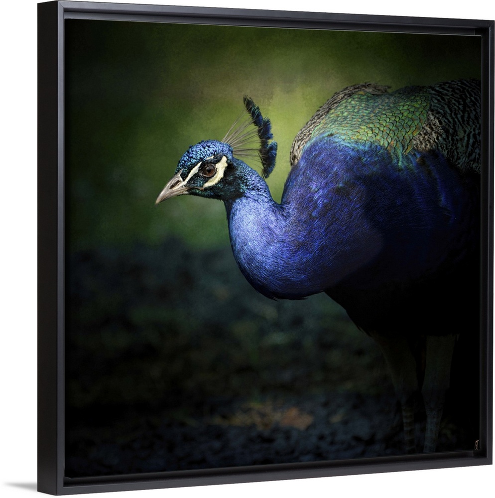 <p>Fine art photo of a brightly peacock emerging form the shadows.</p>