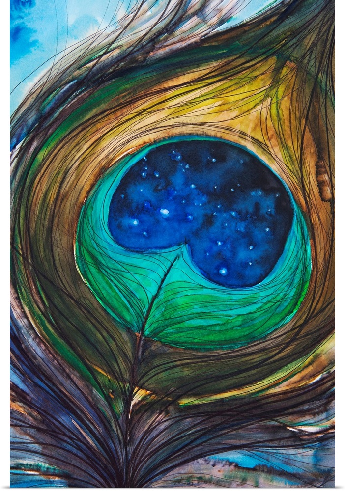 <p>Artwork showing the detail of a colourful bird feather</p>