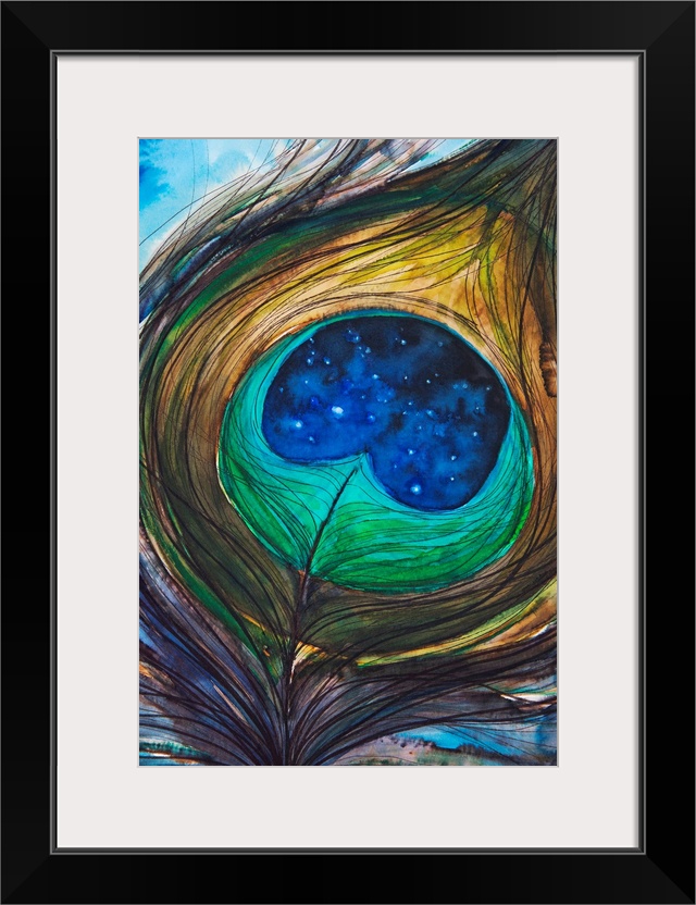 <p>Artwork showing the detail of a colourful bird feather</p>