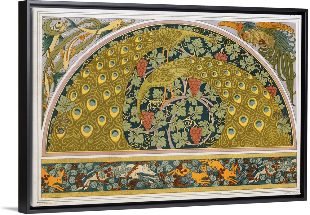 <p>Originally a colour lithograph. Designs For Borders And Corners: "Hares And Dogs In Brambles", Peacocks Amongst Vines With Fish And Seaweed And A Cockerel In The Corners", From 'L'Animal Dans La Decoration' By Maurice Pillard Verneuil, Pub 1897.</p>