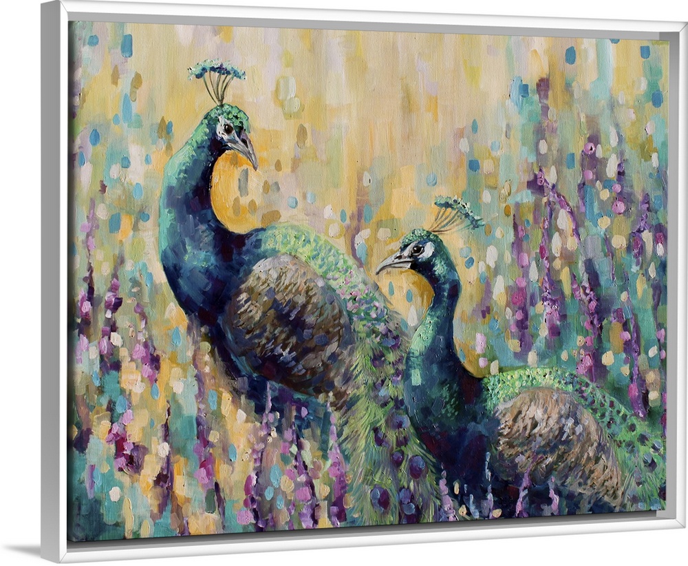 <p>Contemporary painting of two peacocks against a colorful abstract background.</p>