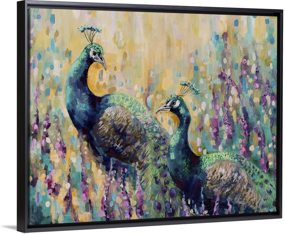 <p>Contemporary painting of two peacocks against a colorful abstract background.</p>