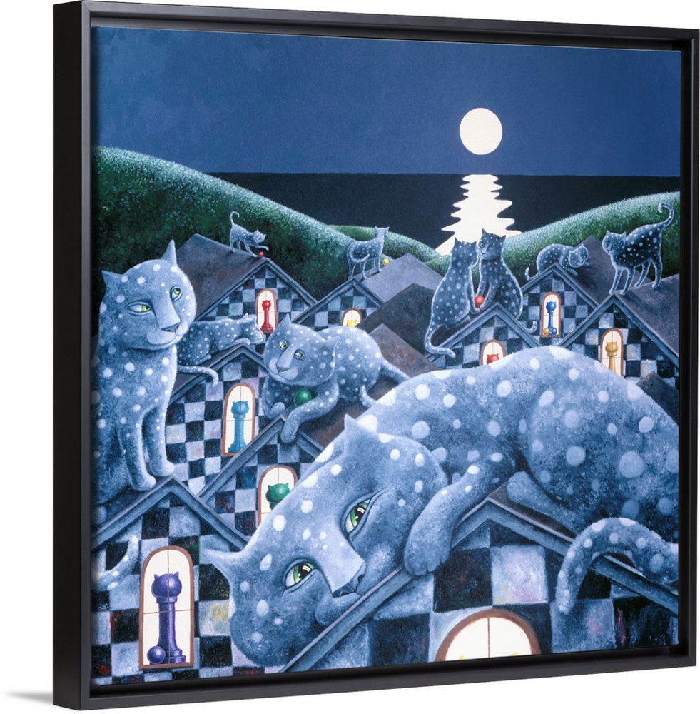 <p>Square illustration of polka dotted cats on checkered roof tops with a full moon in the distance.</p>