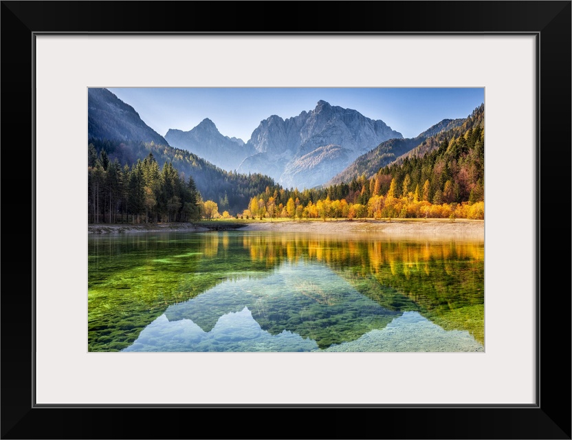 <p>Peaks of Prisojnik and Razor reflected in pools beside the Velika Pisnca River in autumn, Slovenia. Central & Eastern Europe, Slovenia.</p>