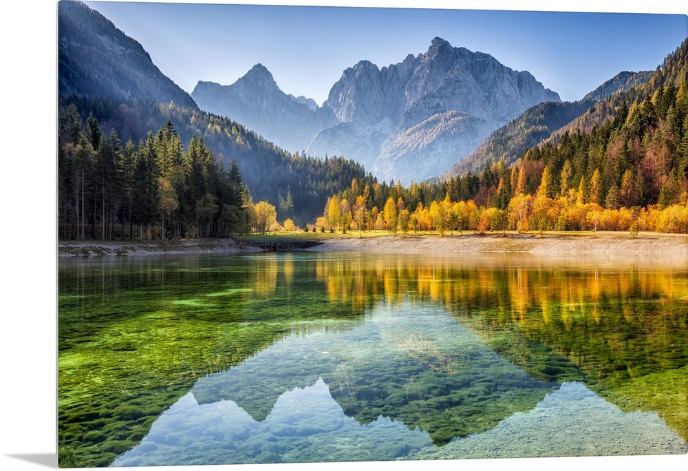 <p>Peaks of Prisojnik and Razor reflected in pools beside the Velika Pisnca River in autumn, Slovenia. Central & Eastern Europe, Slovenia.</p>