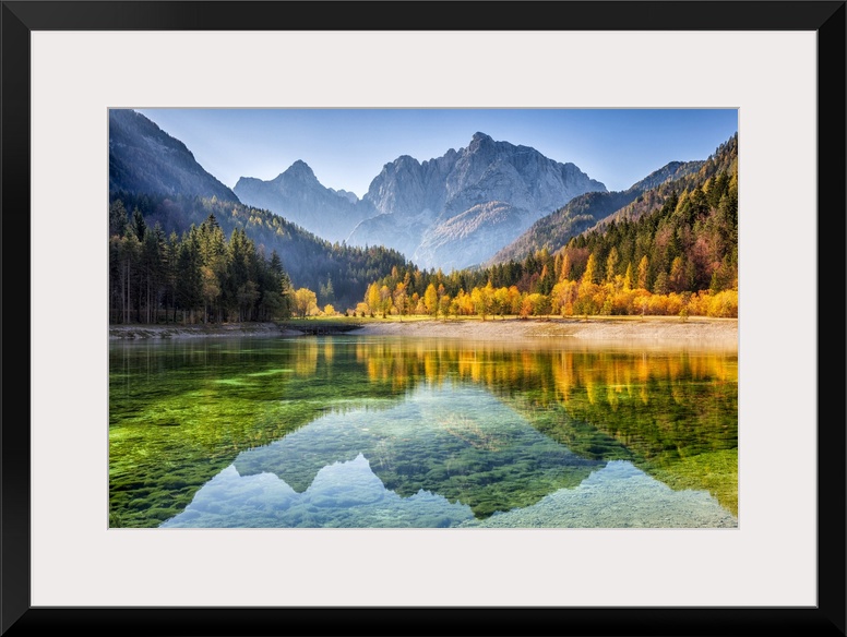<p>Peaks of Prisojnik and Razor reflected in pools beside the Velika Pisnca River in autumn, Slovenia. Central & Eastern Europe, Slovenia.</p>