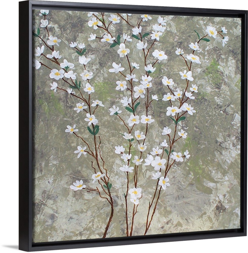 <p>Contemporary painting of thin branches with white pear blossom flowers running vertically up the canvas with a textured brown, green, and gray background.</p>
