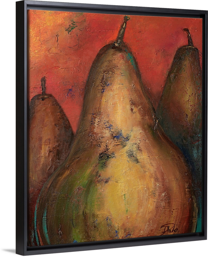 <p>Painting of three pears on a warm background with a brush stroke texture over top.</p>
