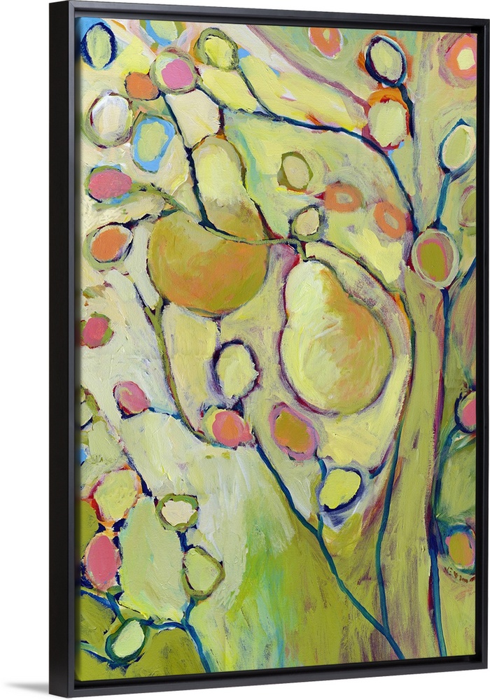 <p>A piece of contemporary artwork of a pear tree with two pears hanging from the branches and colorful buds painted along the branches as well.</p>
