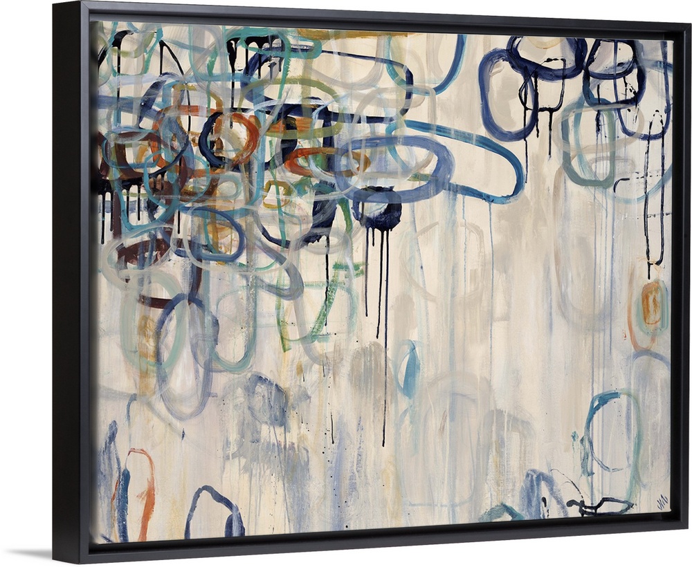 <p>Contemporary painting of overlapping circular shapes in various colors, that seem to fade as they move closer to the background.</p>