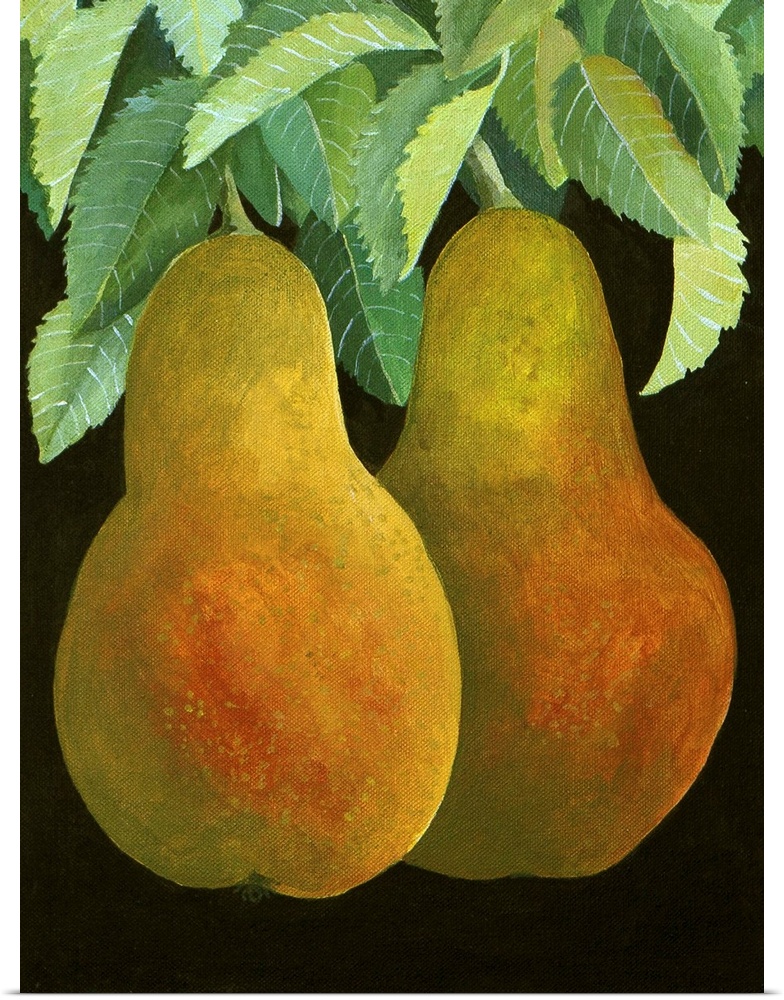 <p>Contemporary painting of two pears hanging from a tree.</p>