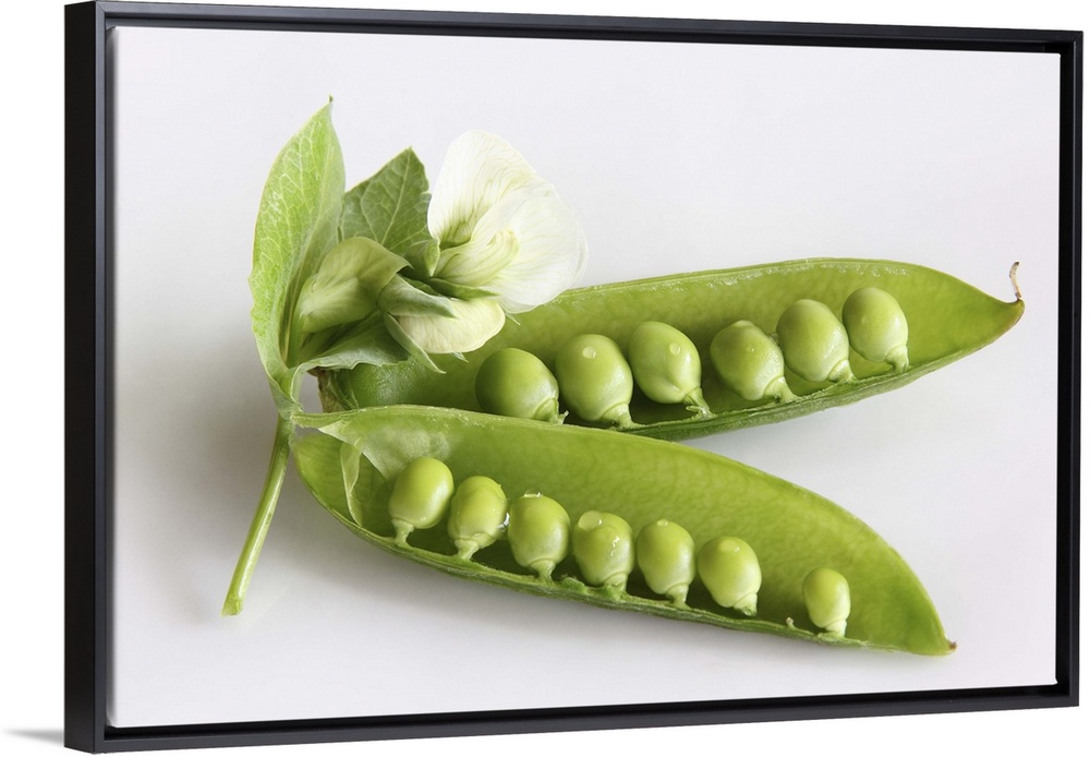 <p>Organic green garden pea flowers and peas in pods on white background, close-up.</p>