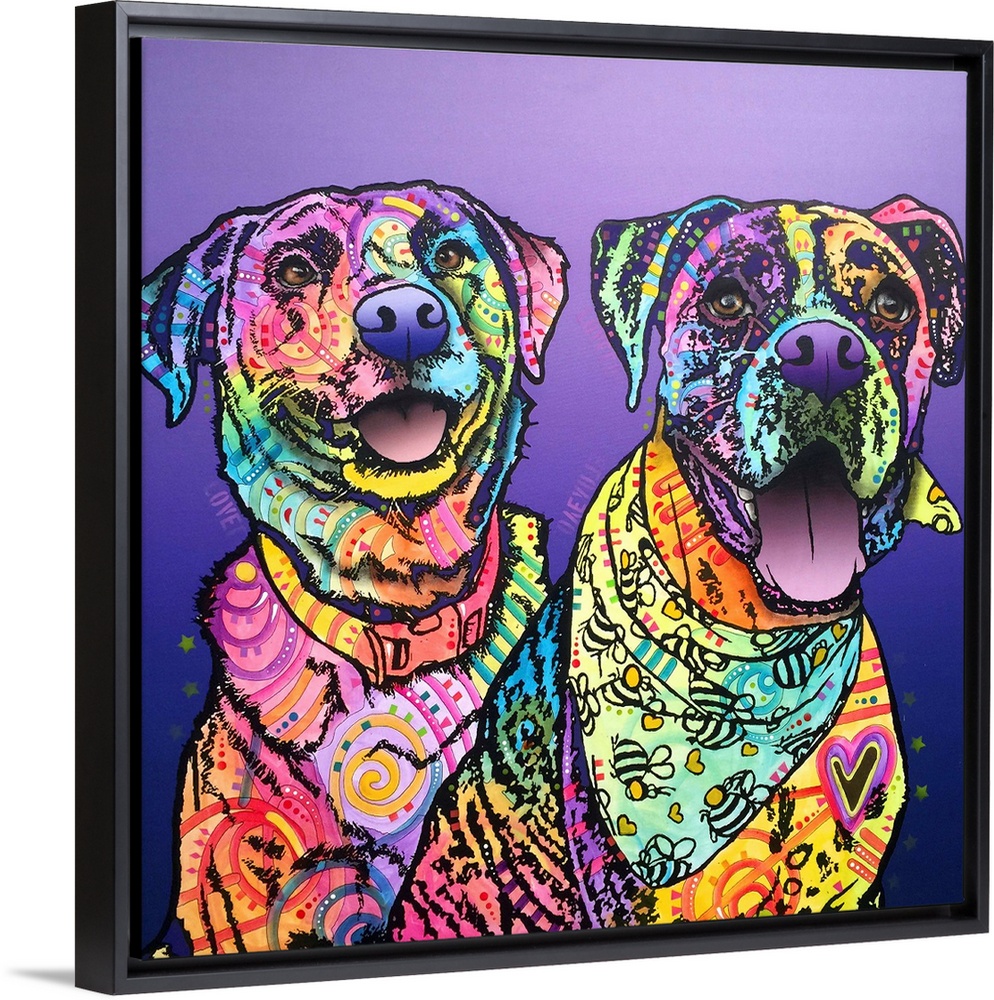 <p>Square painting of two colorful dogs with graffiti-like designs on a purple gradient background.</p>