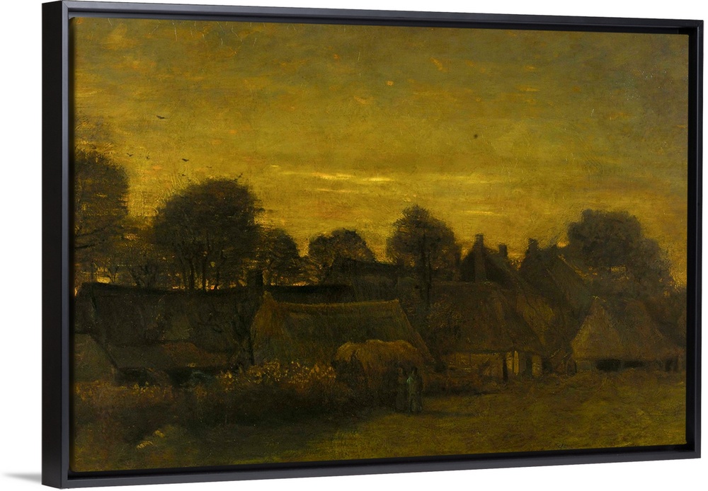 <p>Peasant Village at Dusk, by Vincent van Gogh, 1884, Dutch painting, oil on canvas. Rural village evening light. Several low houses with thatched roofs are on the edge of a meadow with two figures in front of a haystack.</p>