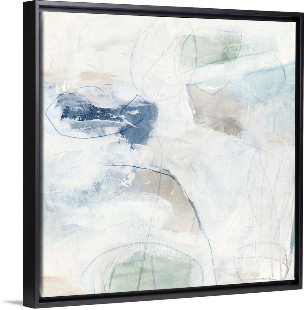 <p>White, pale blue, and neutral browns come together to construct this abstract painting reminiscent of a calm day on the beach.</p>