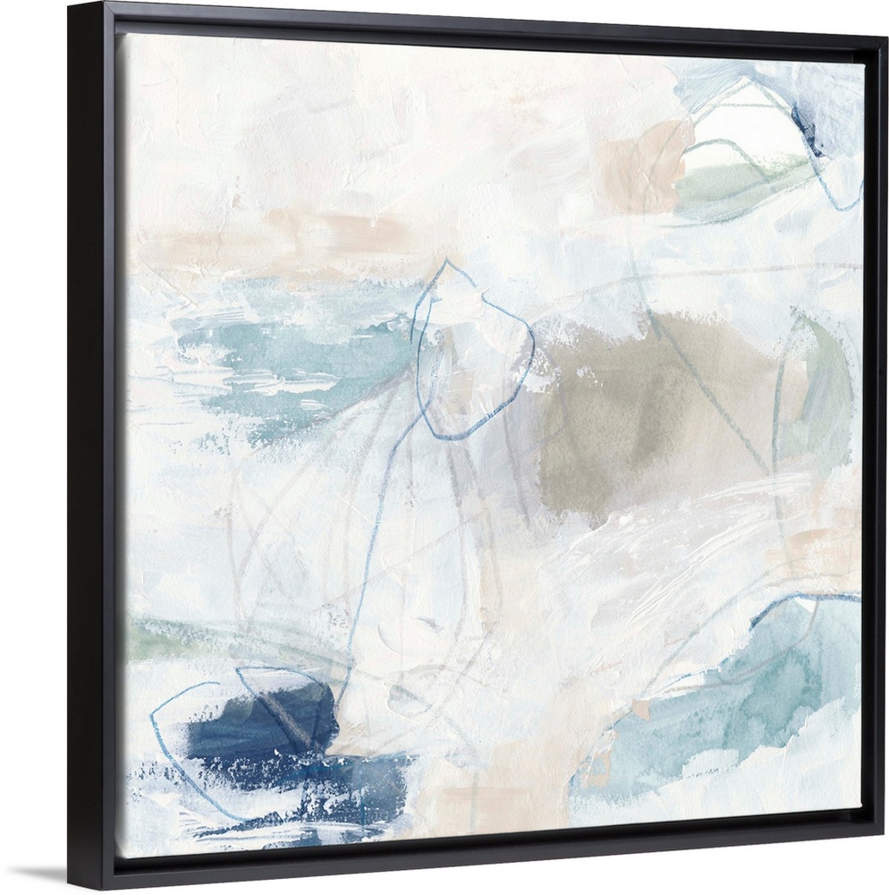<p>White, pale blue, and neutral browns come together to construct this abstract painting reminiscent of a calm day on the beach.</p>
