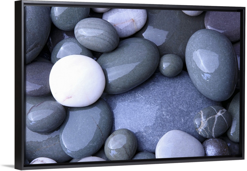 <p>Close up photo of wet, smooth stones in varying oval shapes and gray colors.</p>
