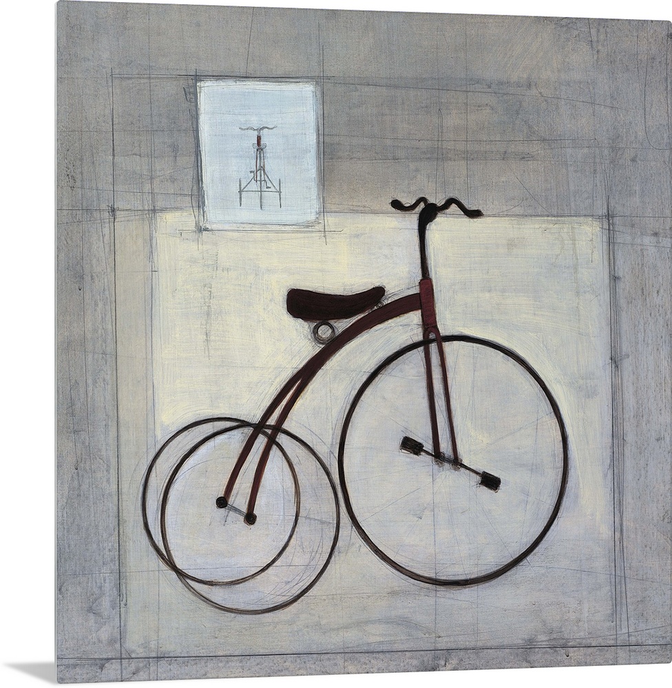 <p>Contemporary painting of large wheeled tricycle against a gray background.</p>