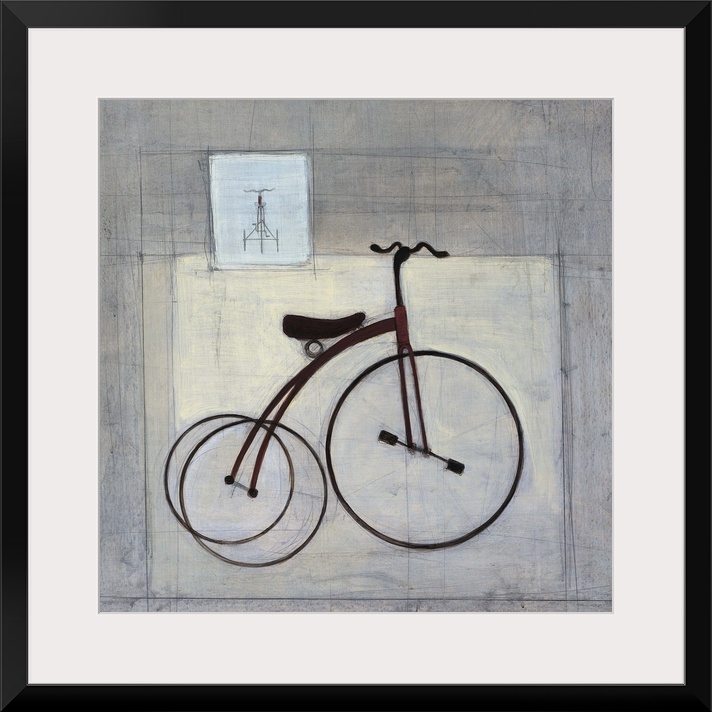 <p>Contemporary painting of large wheeled tricycle against a gray background.</p>