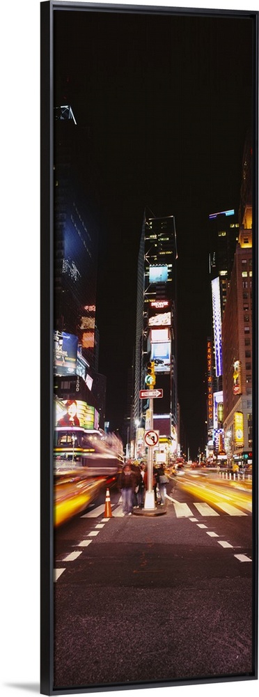<p>This vertical time lapsed photograph shows the blur of motion created by cars driving through Time Square beneath the massive televisions.</p>
