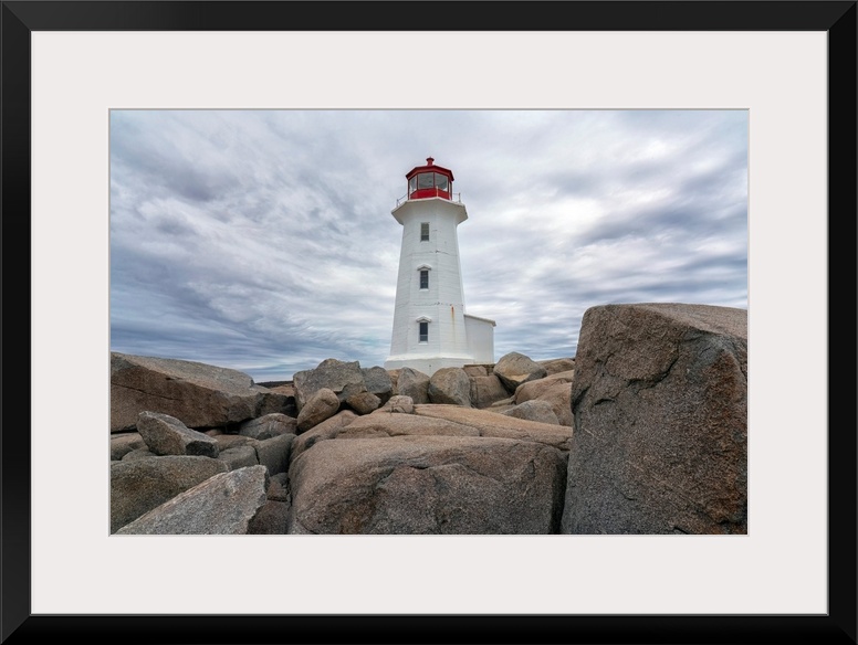 <p>Peggy's Cove lighthouse on a moody day, Nova Scotia.</p>