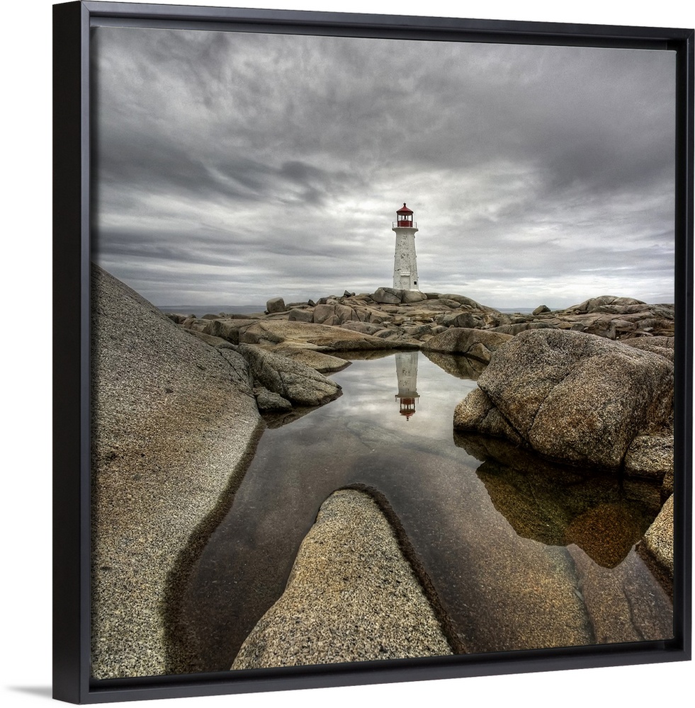 <p>A distant Canadian lighthouse casting its reflection in a rocky tidal pool in the foreground.</p>