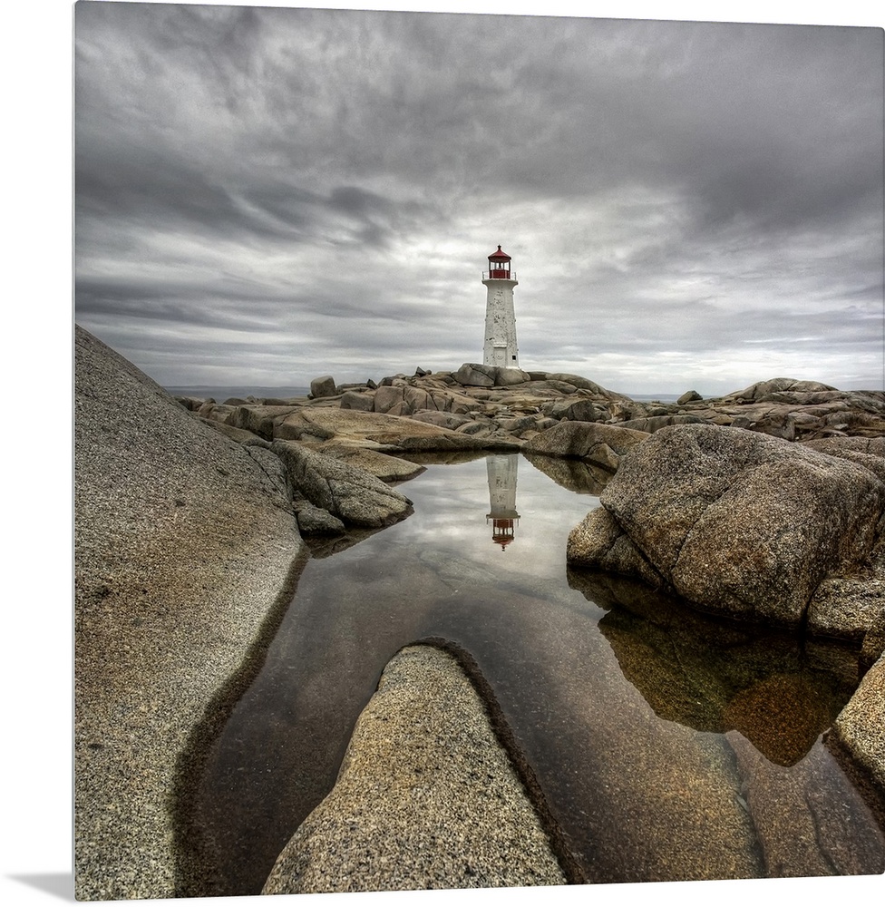 <p>A distant Canadian lighthouse casting its reflection in a rocky tidal pool in the foreground.</p>