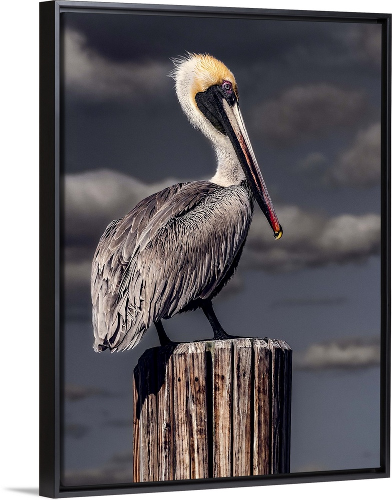 <p>A Brown Pelican perched on a wooden post in front of dark stormclouds.</p>