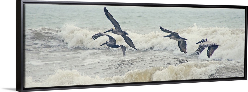 <p>A photograph of four pelicans flying over ocean waves.</p>