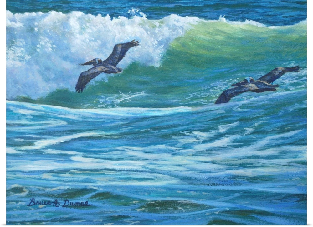 <p>Contemporary painting of two pelicans soaring over a wave about to crash in the ocean.</p>