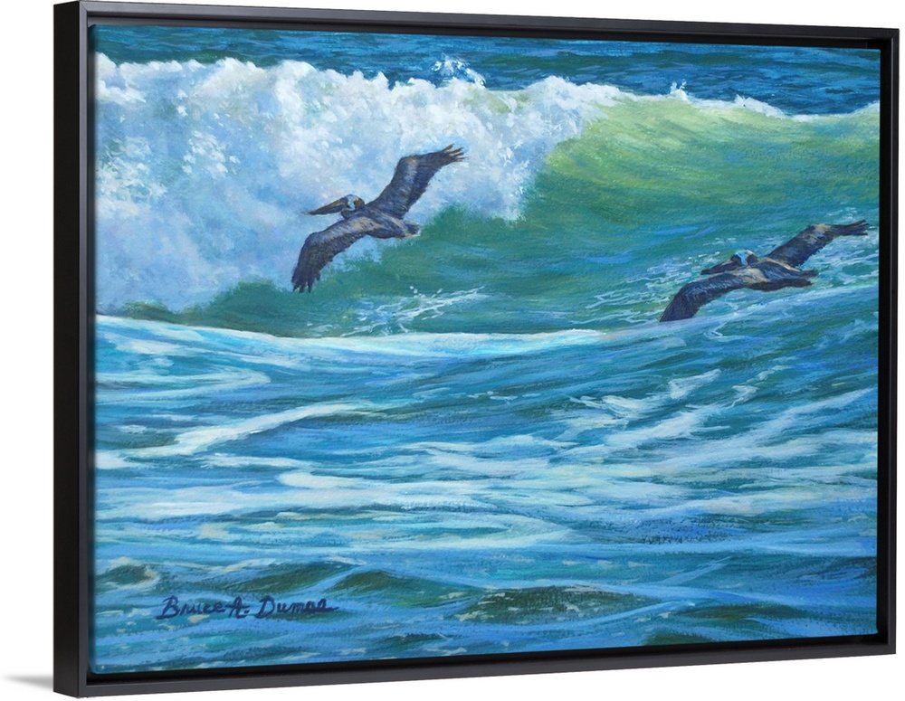 <p>Contemporary painting of two pelicans soaring over a wave about to crash in the ocean.</p>