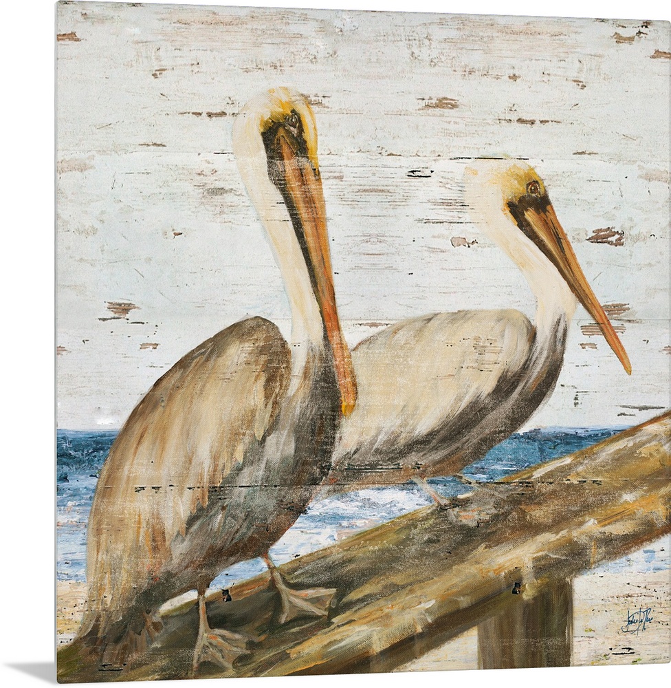 <p>This contemporary artwork features illustrated brush strokes of two pelicans with a distressed texture throughout.</p>