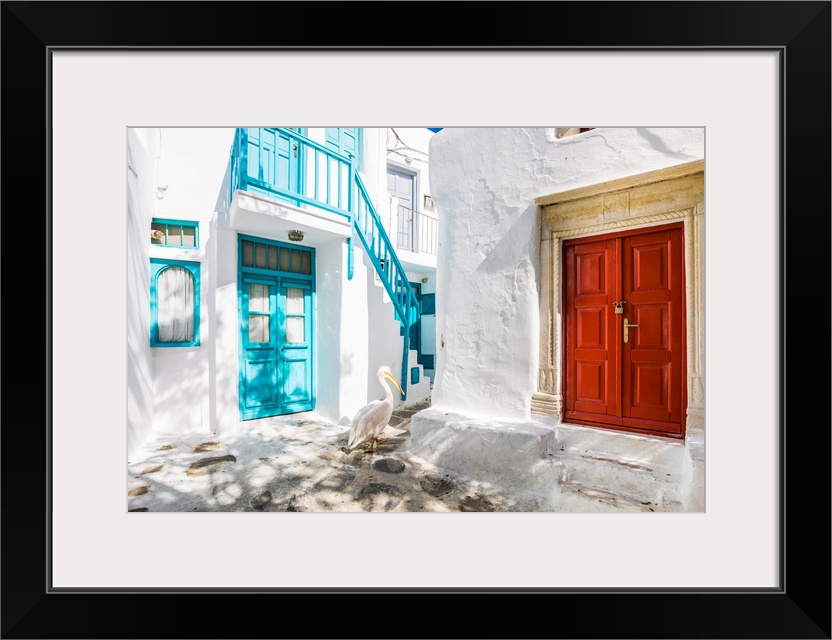 <p>Pelican wandering streets of Chora (Mykonos Town), Mykonos, Cyclades Islands, Greece.</p>