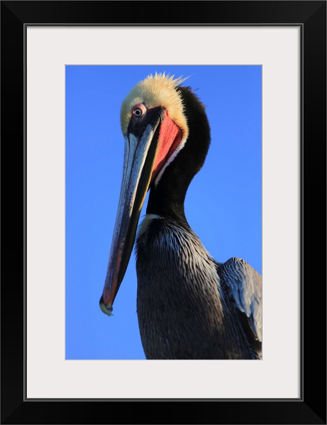 <p>Shelter Island, San Diego, California. Pelican with large eyes bows its head and long beak towards its body.</p>