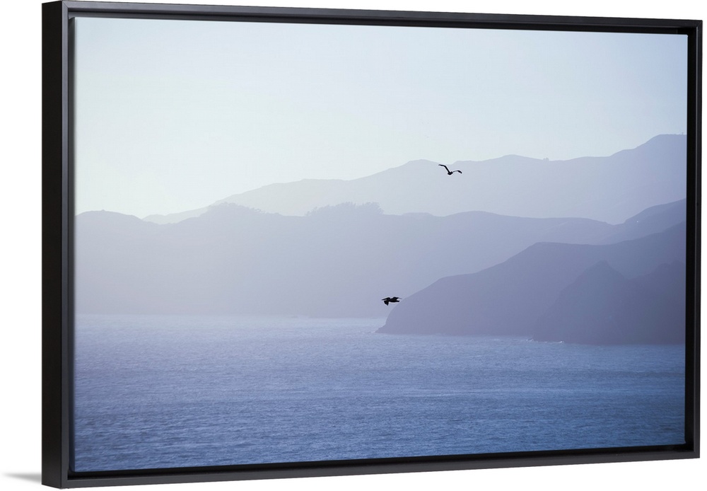 <p>Pelicans drift through the air against shades of blue in San Francisco, California.</p>