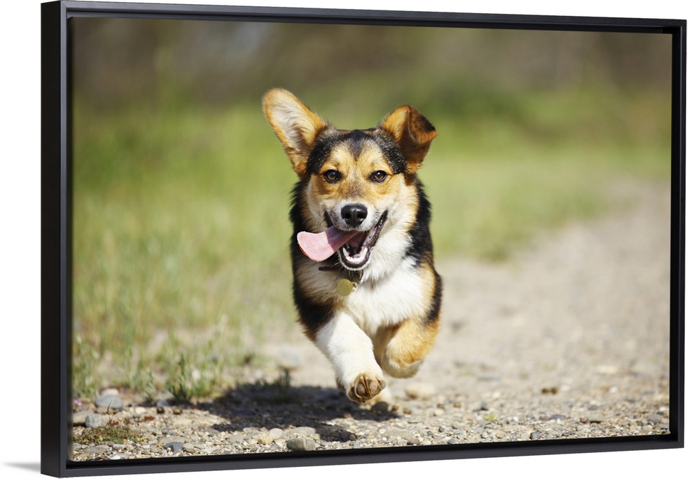 <p>A Pembroke Welsh Corgi smiling as it runs on a sunny Spring day in a park outdoors.</p>