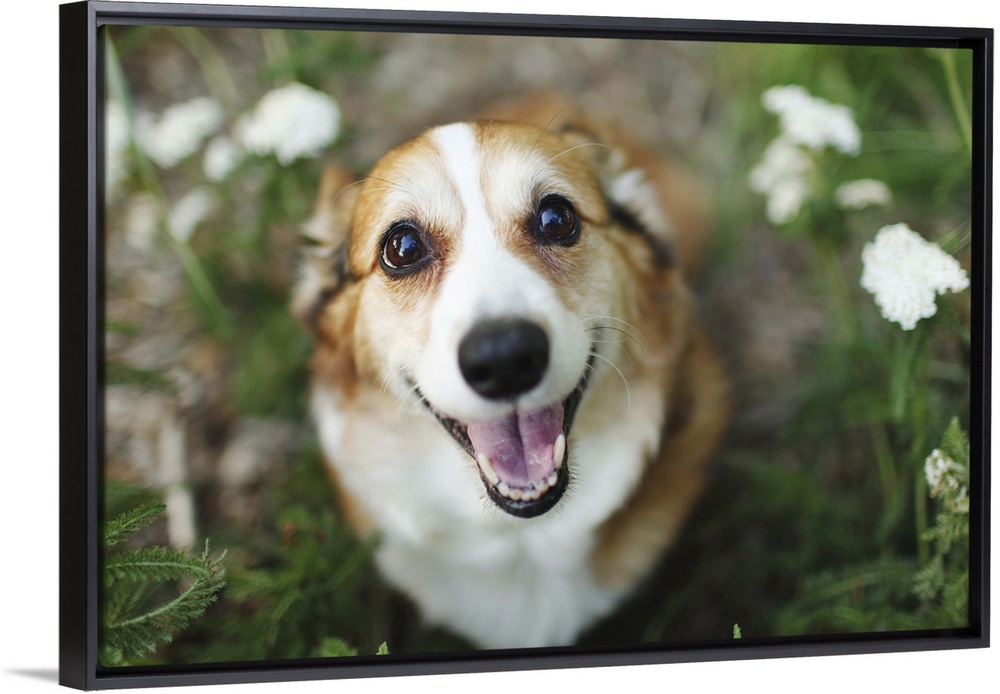 <p>A happy looking Welsh Corgi sitting on the ground amongst white flowers and greenery smiles up at the camera.</p>