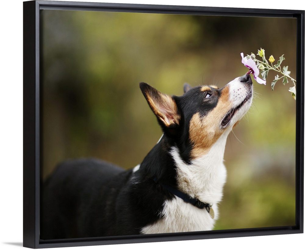 <p>A Welsh Corgi dog intently smells a single flower against a diffuse green background.</p>