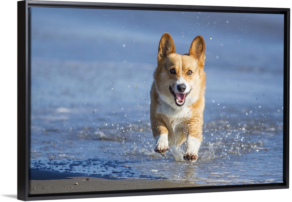 <p>An energetic Pembroke Welsh Corgi dog splashing through water at the beach on a sunny afternoon.</p>
