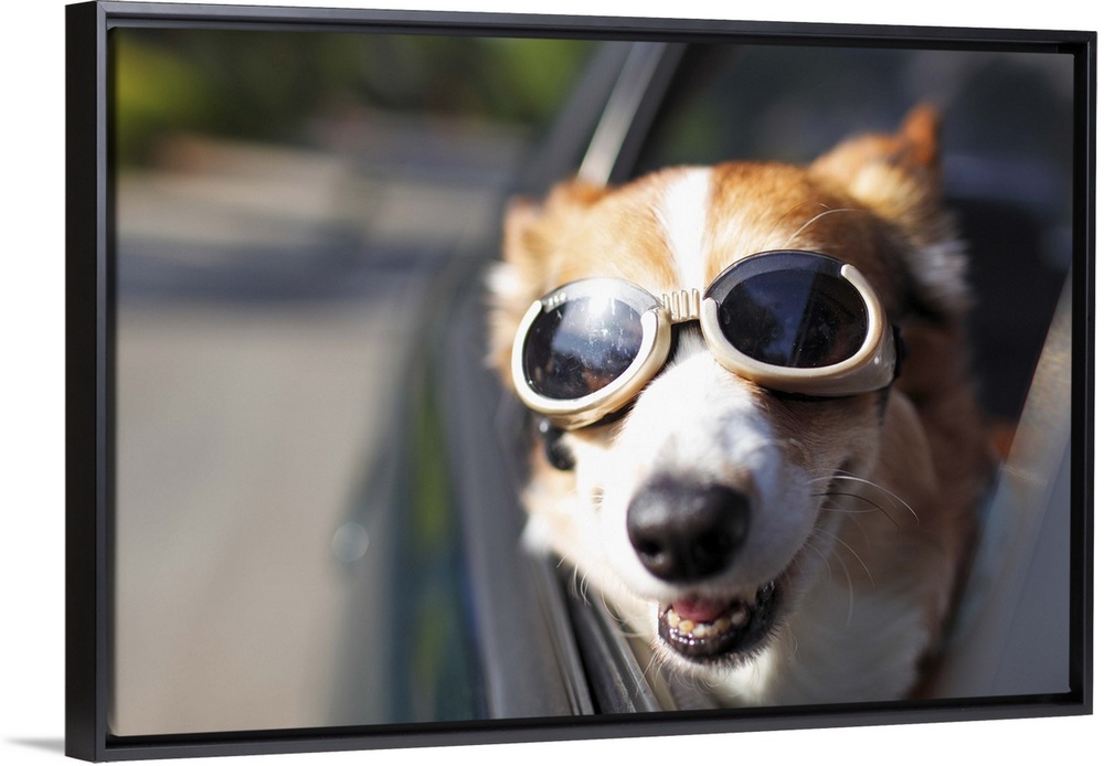 <p>A Welsh Corgi wearing goggles sticks its head out of a car window during a car ride on a sunny day.</p>