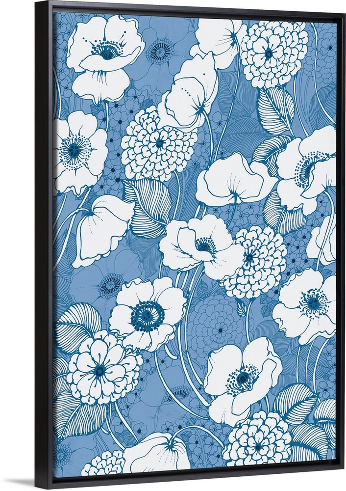 <p>A vertical image of white poppy flowers outlined in blue on a blue floral backdrop.</p>