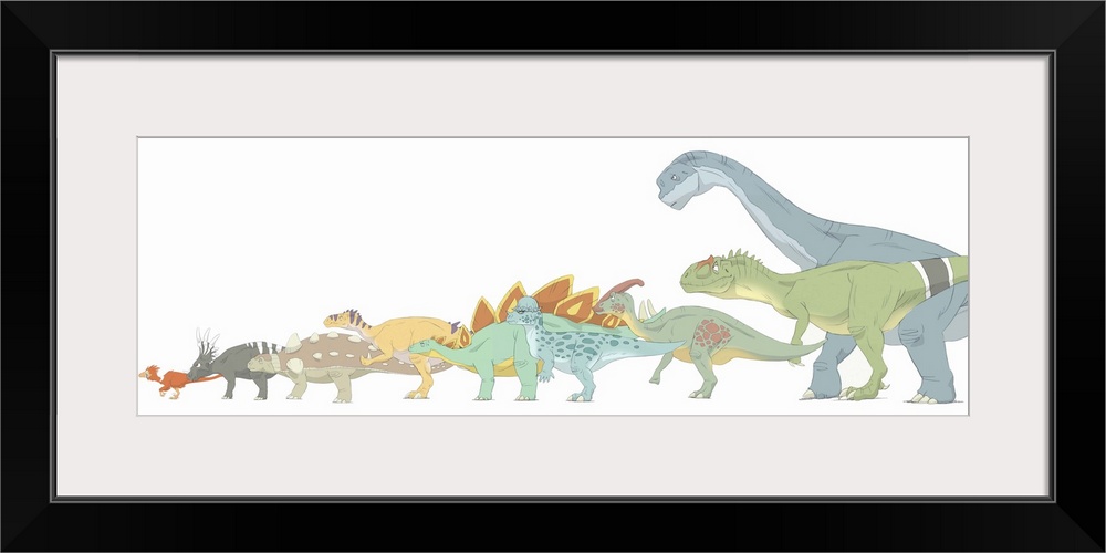 <p>Pencil drawing illustrating various dinosaurs and their comparative sizes.</p>
