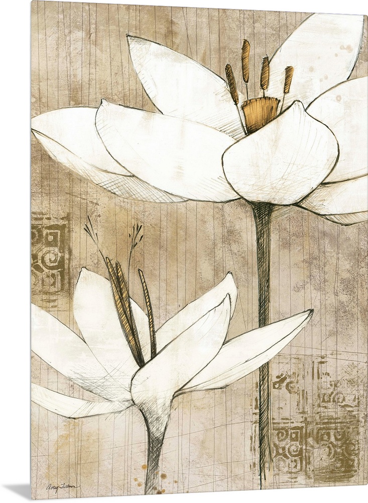 <p>Contemporary artwork of white flowers against a rustic and weathered looking background.</p>