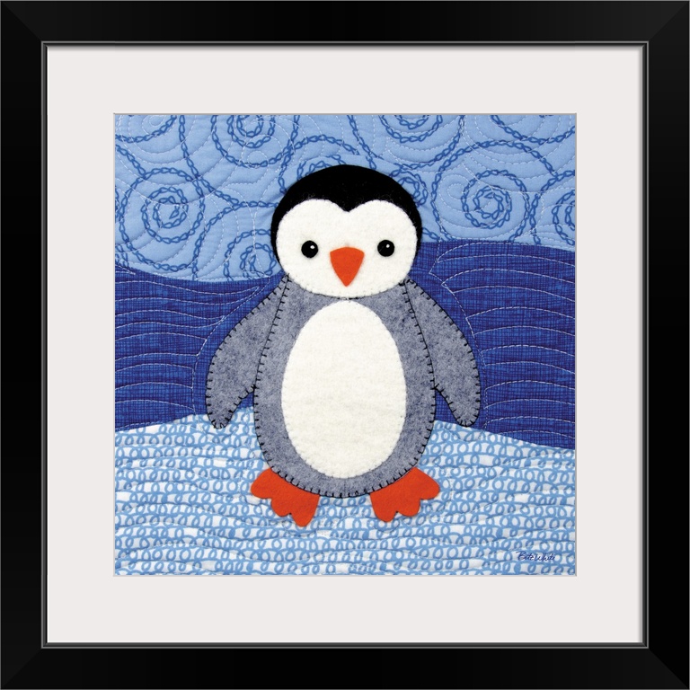 <p>Square sewn art with a penguin on a blue patterned background.</p>