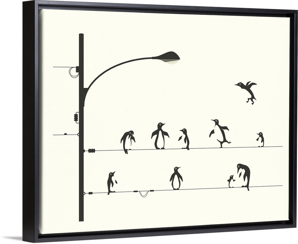 <p>Black and white whimsical illustration of penguins walking and balancing on lamp post wires.</p>
