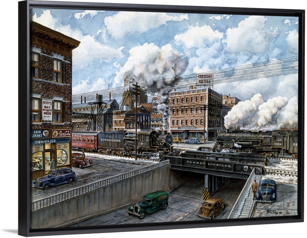 <p>Contemporary painting of a train passing over a tunnel with thick smoke billowing from it's stack.</p>
