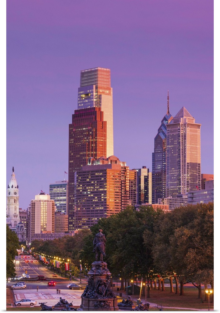 <p>USA, Pennsylvania, Philadelphia, city skyline from the Benjamin Franklin Parkway, dusk</p>