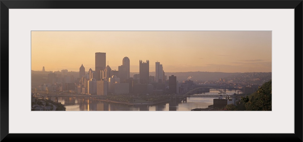 <p>This is a panoramic photograph of the city skyline between two rivers becoming silhouetted in the late afternoon light.</p>