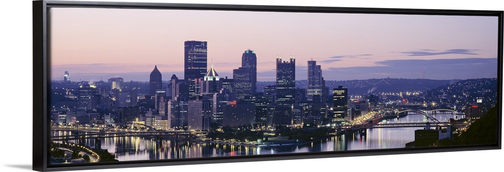 <p>Panoramic photograph of skyline and waterfront lit up at sunset.</p>