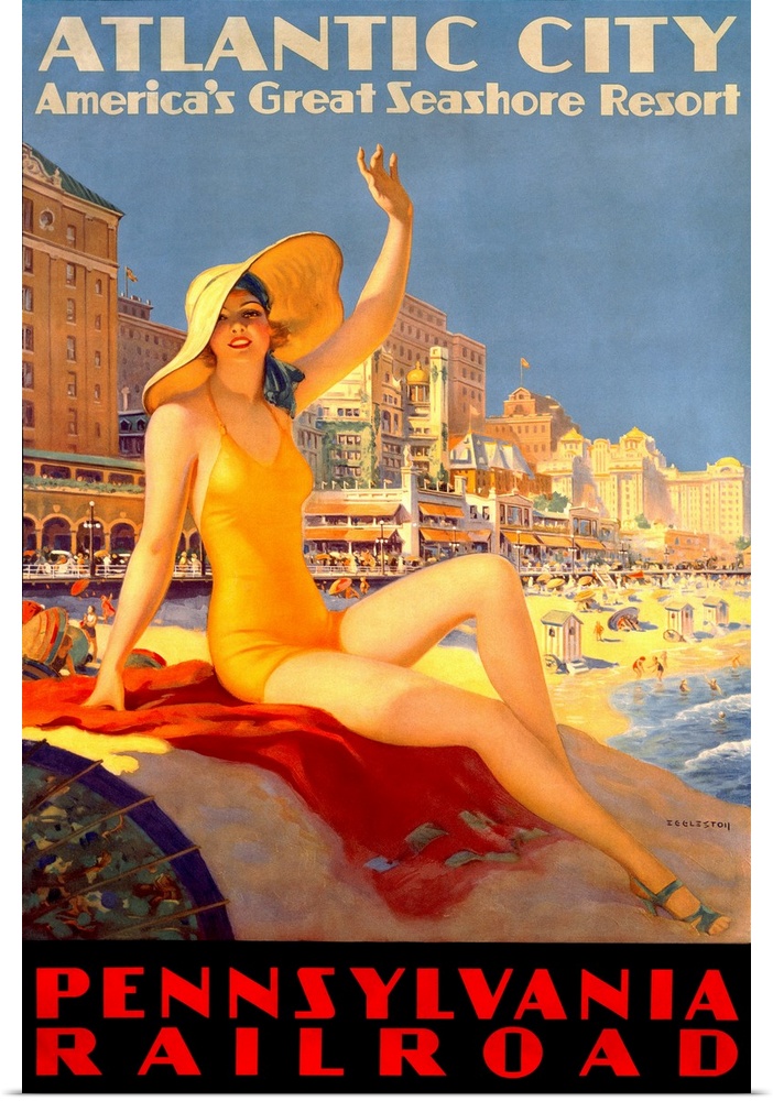 <p>Antique poster advertising beach resort. A woman in a swimsuit and hat sits on a rock waving with shoreline filled with beach goers and boardwalk behind her.</p>